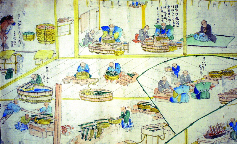 1615(元和元)年、大坂夏の陣からの帰りに岐阜に滞在した徳川家康・秀忠父子が鵜飼を観覧したと伝えられています。その際食した鮎鮨を気に入ったのでしょうか、同年、将軍家への鮎鮨献上が始まりました。同時に、鵜匠には川の自由な航行や、冬に鵜の餌を求めて餌飼(えがい)をすることが認められるなど、さまざまな特権が与えられました。