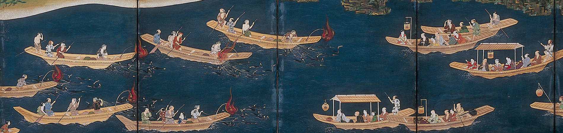 1646(正保3)年、初代尾張藩主徳川義直の鵜飼上覧を皮切りに、歴代尾張藩主による長良川鵜飼の上覧が慣例とされてきました。また、1688(貞享5)年6月、松尾芭蕉は岐阜を訪れ、弟子とともに鵜飼を観覧しました。その時に詠んだのが「おもしろうて やがて悲しき 鵜舟かな」です。