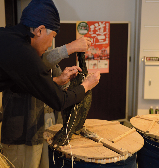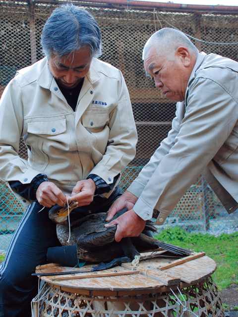 出漁時刻が近づくと、鵜匠は首結いを鵜の首の付け根あたりに結います。大きな魚が首で止まり、小さな魚が首を通って鵜が食べられるよう、長年の経験に基づき最適な結び加減で素早く結います。また、首結いがずれるのを防ぐため、首の後ろから左右の羽根元を通して腹に紐をつけます。これが腹掛けです。