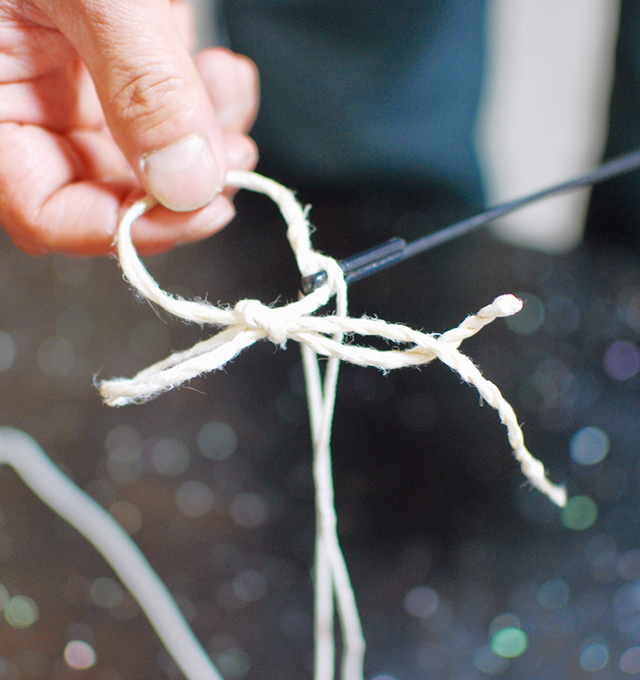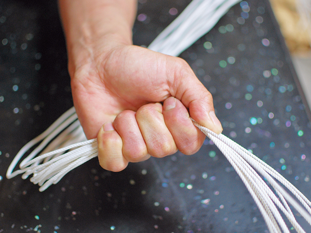 首結いの紐は、鵜匠が麻の繊維を撚(よ)ったものを用います。鵜の首に当たる部分は緩く撚り、縛る部分はきつく撚ります。麻を素材とするのは、鵜にとって触れ心地が良いことに加え、水に濡れると締りやすいからだと言われています。