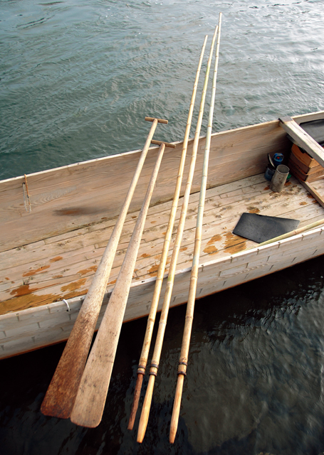 鵜舟の船頭は、艫(とも)(船尾側)に乗る「艫乗り」と、鵜匠の背の横に乗る「中乗り」がいます。艫乗りは操船の責任者で、中乗りは操船や鵜匠の補助を行います。
