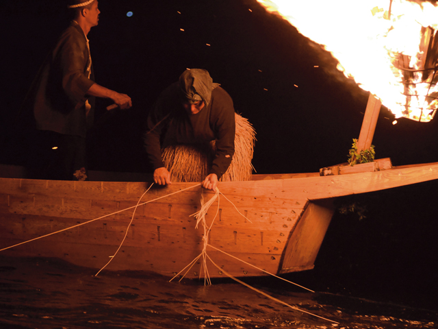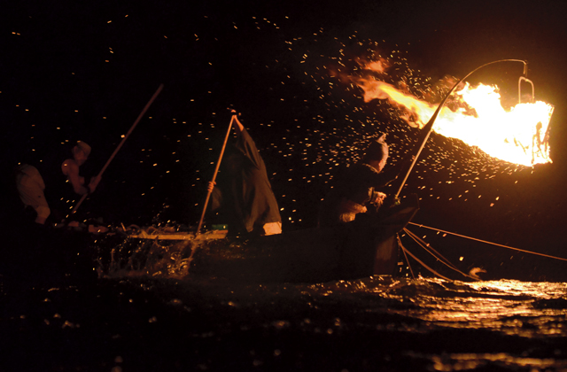 鵜匠は鵜舟の上で、魚を捕らえた鵜を船縁に引き上げ、吐け籠に魚を素早く吐かせたり、火の勢いが弱くならないよう、篝に松割木を足したりするなど、複数の動きを同時かつ迅速に行わなければなりません。